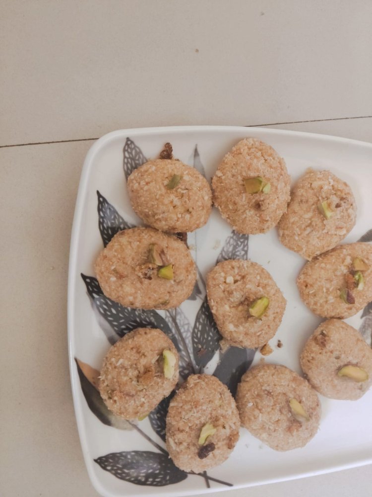 सबसे पहले एक कढ़ाई में घी गर्म करें और उसमें गोंद को तल लें। इसके बाद काजू, बादाम और पिस्ते को छोटे-छोटे टुकड़ों में काटकर हल्का फ्राई कर लें। यदि कढ़ाई में घी कम हो जाए, तो थोड़ा घी और डालें और उसमें मोटा गेहूं का आटा डालकर मध्यम आंच पर सुनहरा होने तक भूनें।