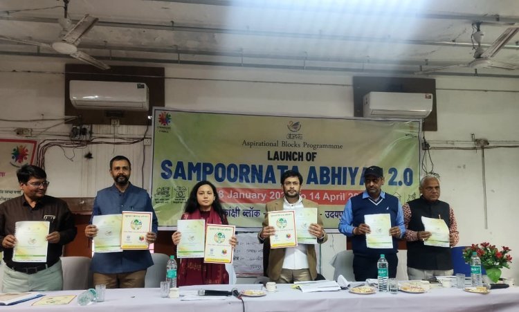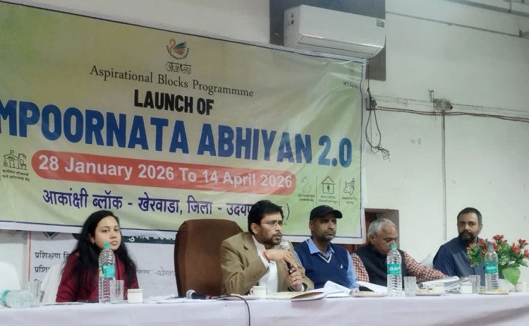 उदयपुर के खैरवाड़ा में नीति आयोग के आकांक्षी ब्लॉक कार्यक्रम अंतर्गत संपूर्णता अभियान 2.0 का शुभारंभ हुआ। जिला कलेक्टर नमित मेहता ने टॉप-10 रैंकिंग और शत-प्रतिशत लक्ष्य हासिल करने के निर्देश दिए।