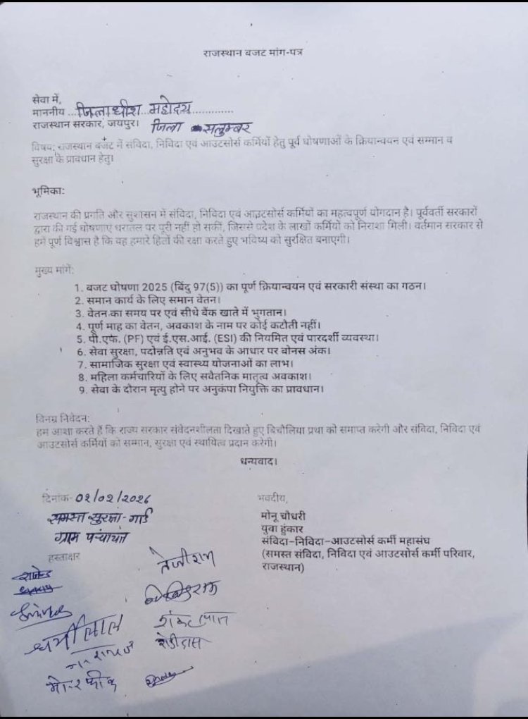 राजस्थान बजट 2026: संविदा-निविदा-आउटसोर्स कर्मियों की मांगें, मुख्यमंत्री के नाम सौंपा ज्ञापन